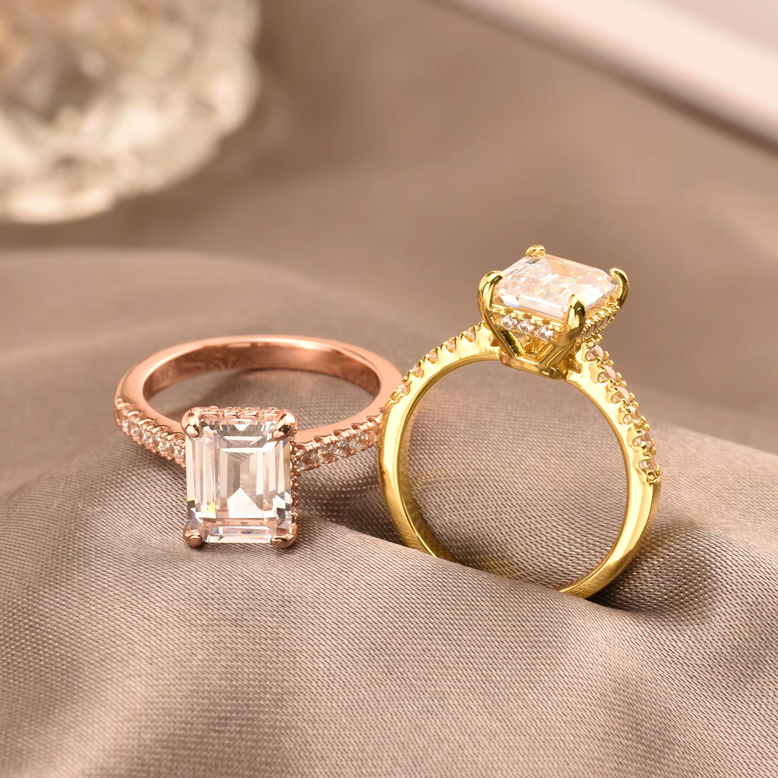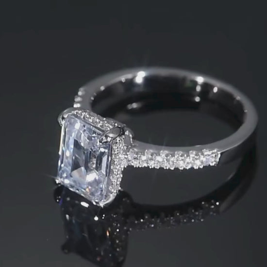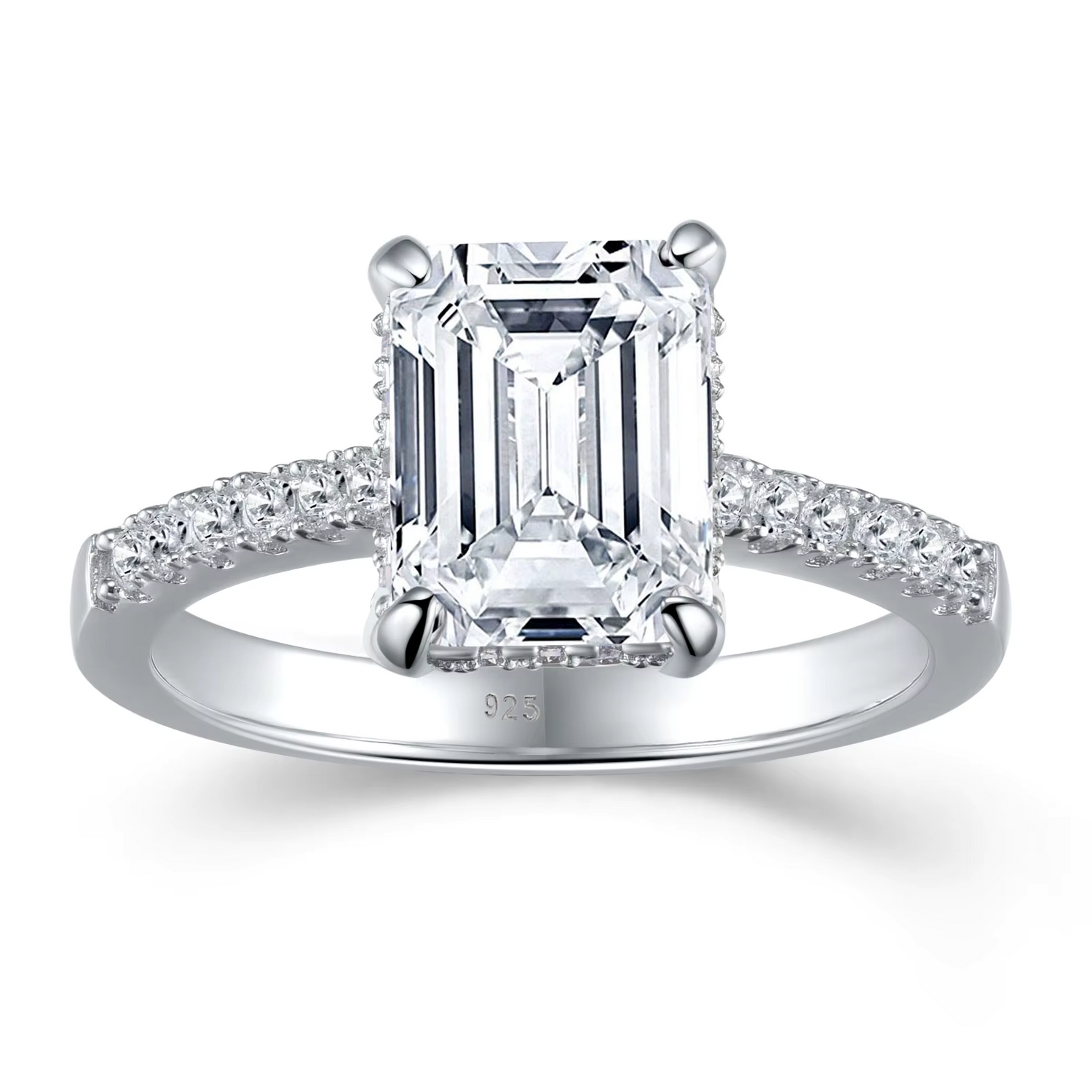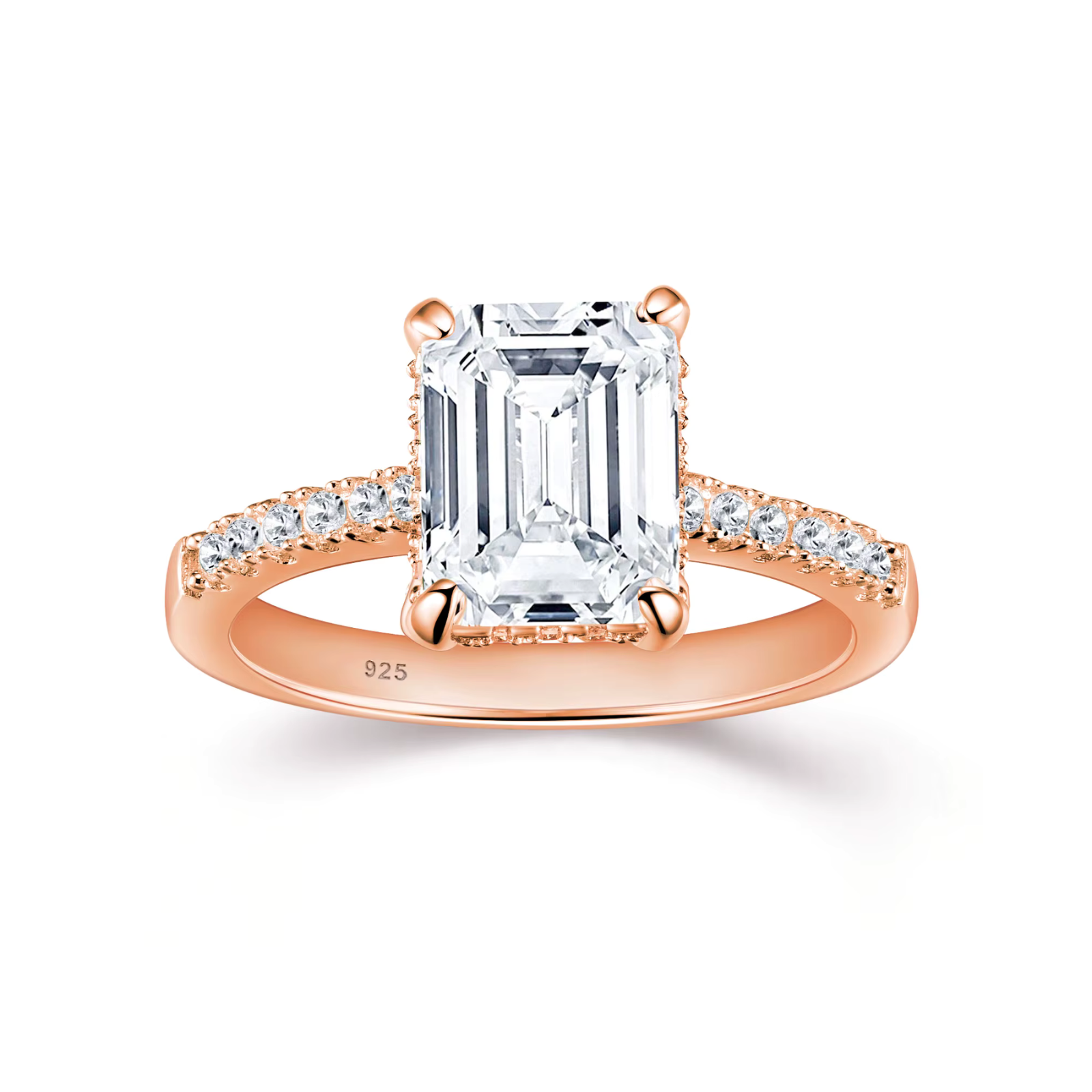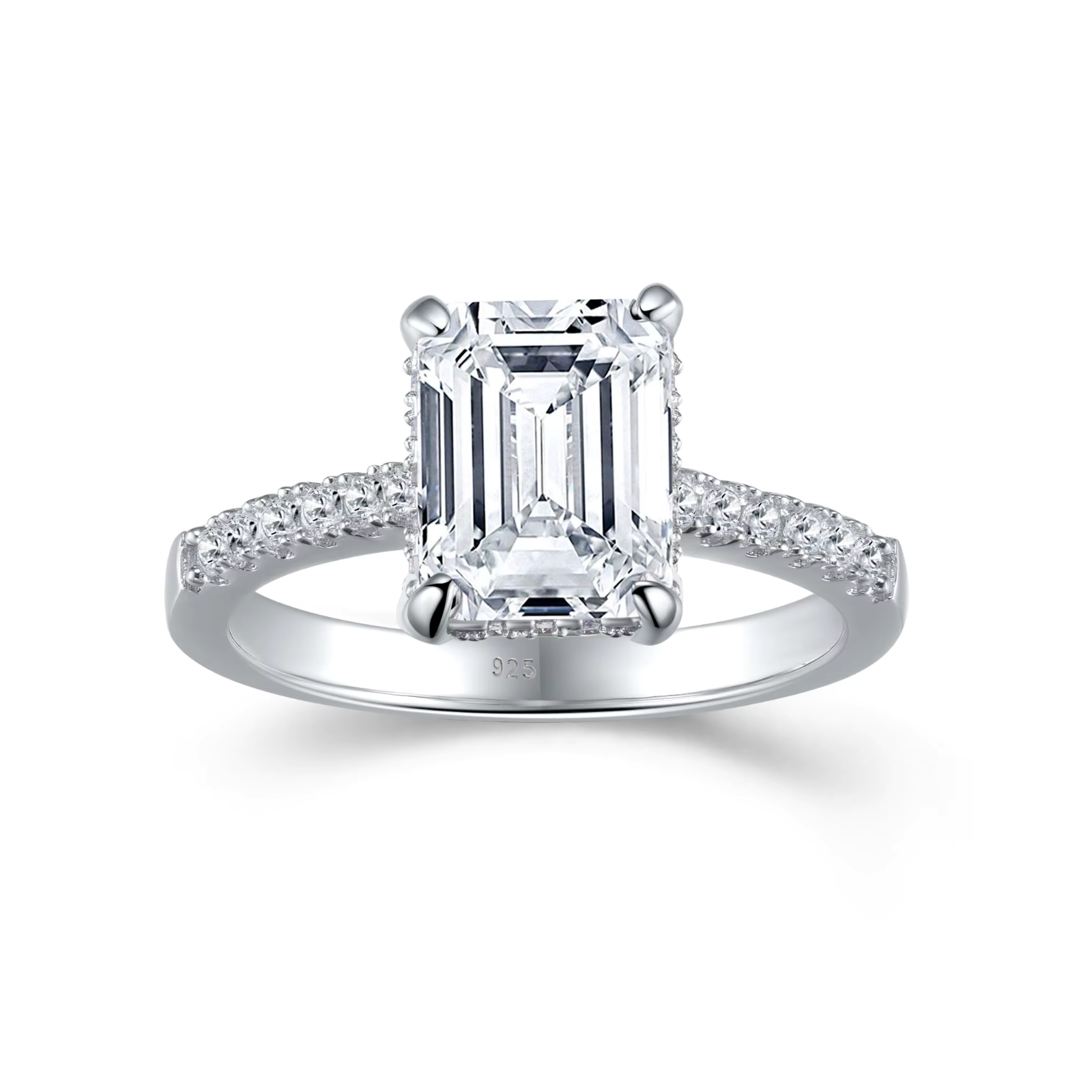 Featuring a stunning 3CT Emerald Cut Simulated Diamond as the centerpiece with a hidden halo and half eternity band. Creating the perfect look to mark any occasion.