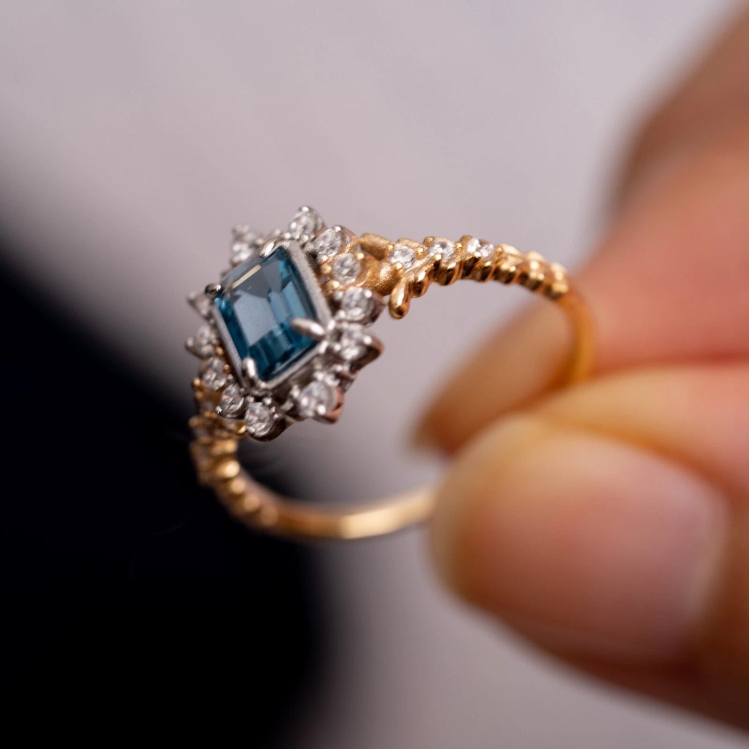 The Marina ring features a beautiful Emerald Cut Natural Topaz, surrounded by shimmering simulated diamonds, making it an exquisite choice for special occasions.